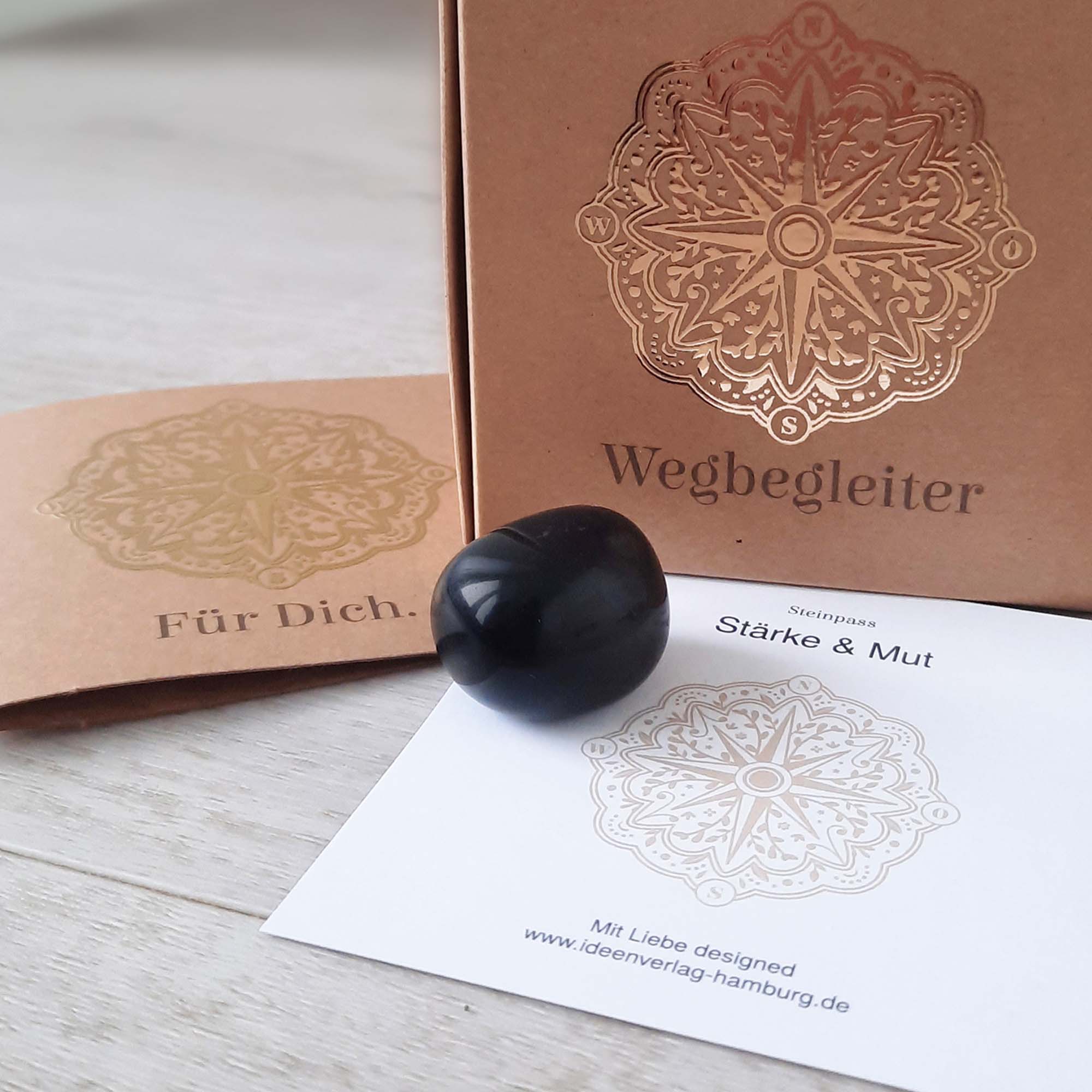 Der schwarze Onyx gehört zur Familie der Chalcedone, einer Unterart von Quarz. Das bedeutet, er besteht hauptsächlich aus Siliziumdioxid. Onyx gibt es in vielen Farben, fast alle außer Blau und Violett, und oft mit Streifen in Schwarz-weiß. Wenn man von Onyx spricht, denken die meisten jedoch an einen tiefschwarzen Stein. Dieser Edelstein wird in Minen auf der ganzen Welt gefunden. Einige der wichtigsten Fundorte sind: Madagaskar, Argentinien, China, Indien, Brasilien, Uruguay, Indonesien und sogar Deutschland. Er kann als Glücksbringer dienen, der Schutz und positive Energie spendet, als Handschmeichler, der in stressigen Momenten beruhigt, oder einfach als stilvolles Dekoelement, das jedem Raum das gewisse Extra gibt. Seine vielfältige Symbolik machen ihn zu einem einzigartigen Geschenk für jeden Anlass, sei es ein Geburtstag, ein Jubiläum oder einfach nur, um jemandem eine Freude zu machen. Er kommt in einer schönen Box aus natürlichem Kraftpapier, zusammen mit einer persönlichen Grußkarte und einer kleinen Beschreibung des Onyx-Steins zu dir nach Hause. So wird das Auspacken zu einem besonderen Moment, der Freude macht und inspiriert.
