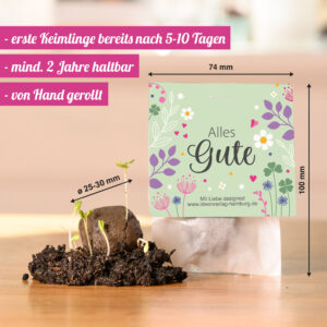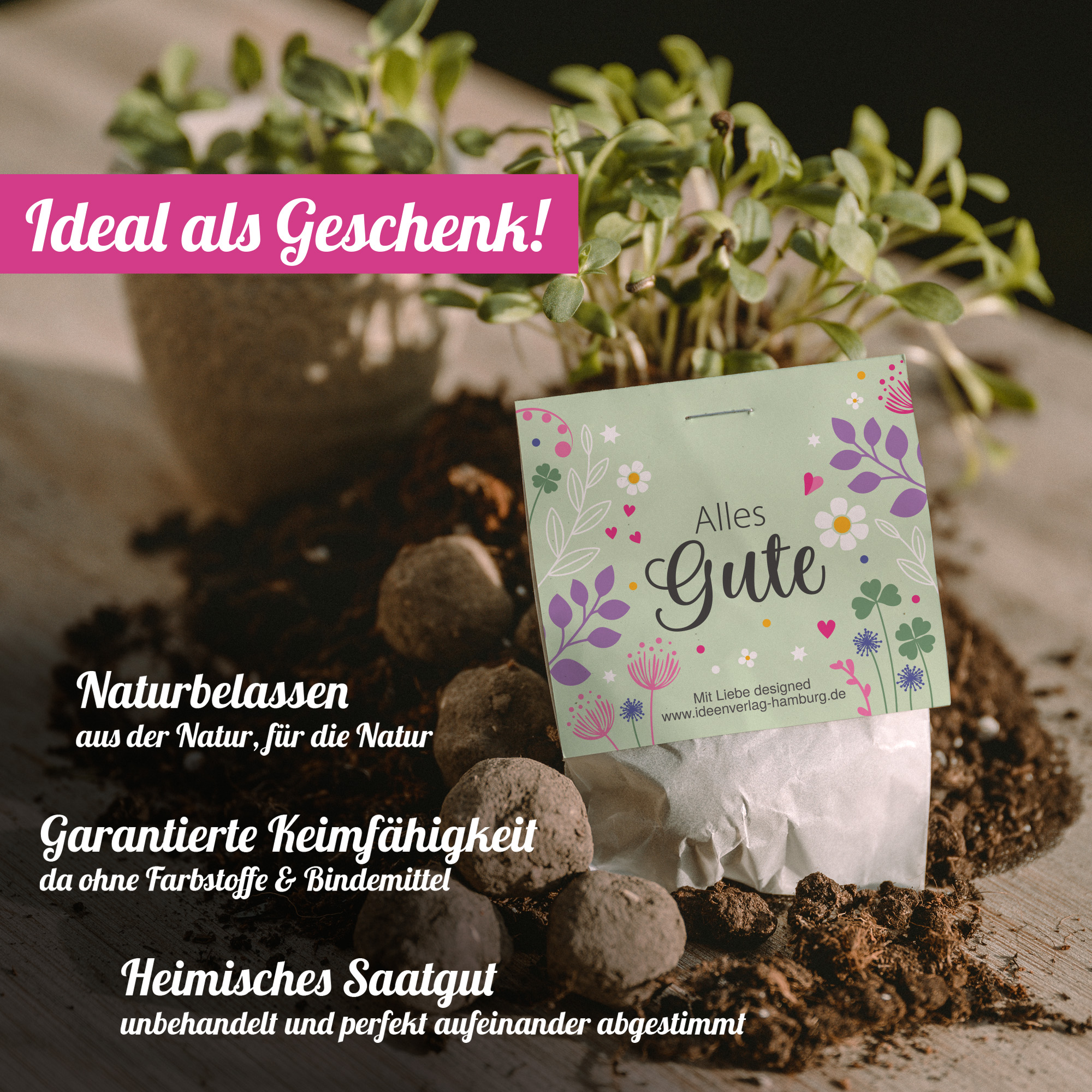 Runde Blumengrüße: Das sind die einzigartigen „Alles Gute“ Motto Samenbomben vom Ideenverlag-Hamburg. Ein nachhaltiges Geschenk zur Verabschiedung, Genesung oder als Aufmerksamkeit zwischendurch. Ideale Giveaways für Freunde, Familie, Kinder, Kindergeburtstage, Kollegen, Nachbarn und andere Lieblingsmenschen. Ein Mitgebsel mit Lerneffekt, Bezug zur Natur und ein aktiver Beitrag gegen das Bienensterben (heimische und nektarreiche Wildblumen). Das Prinzip ist dabei ganz einfach:
